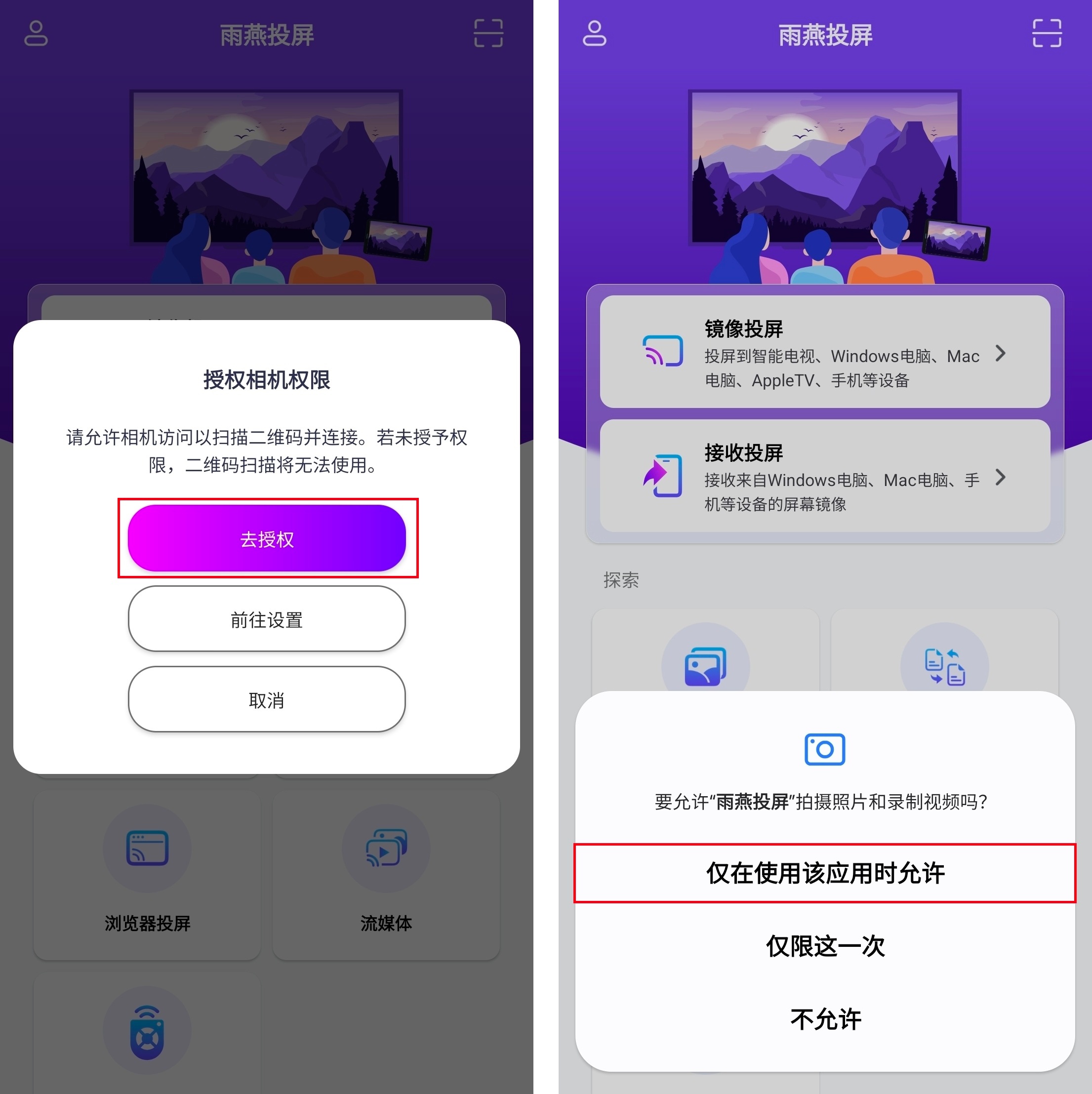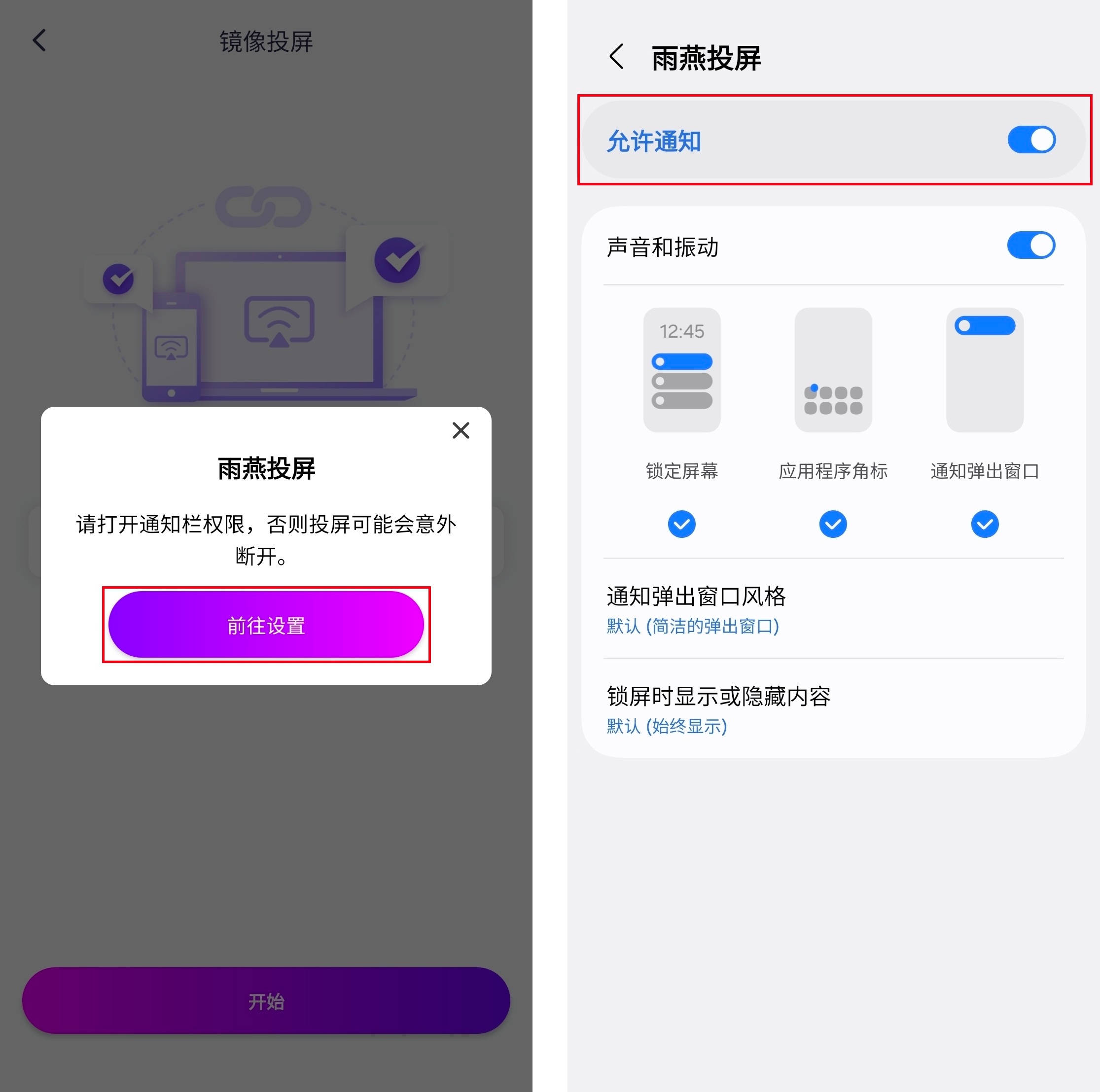 在投屏之前,您需要授予通知权限才能在通知栏中查看状态。