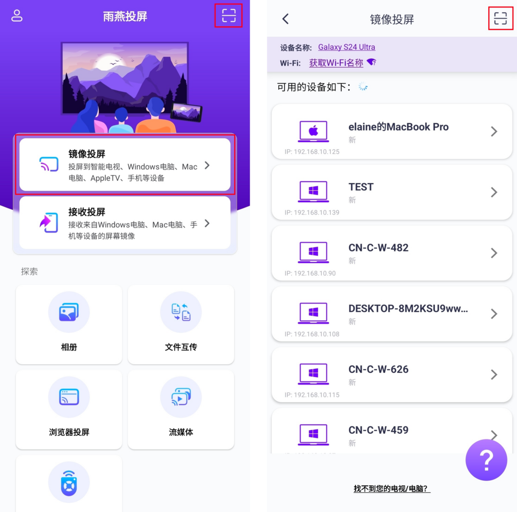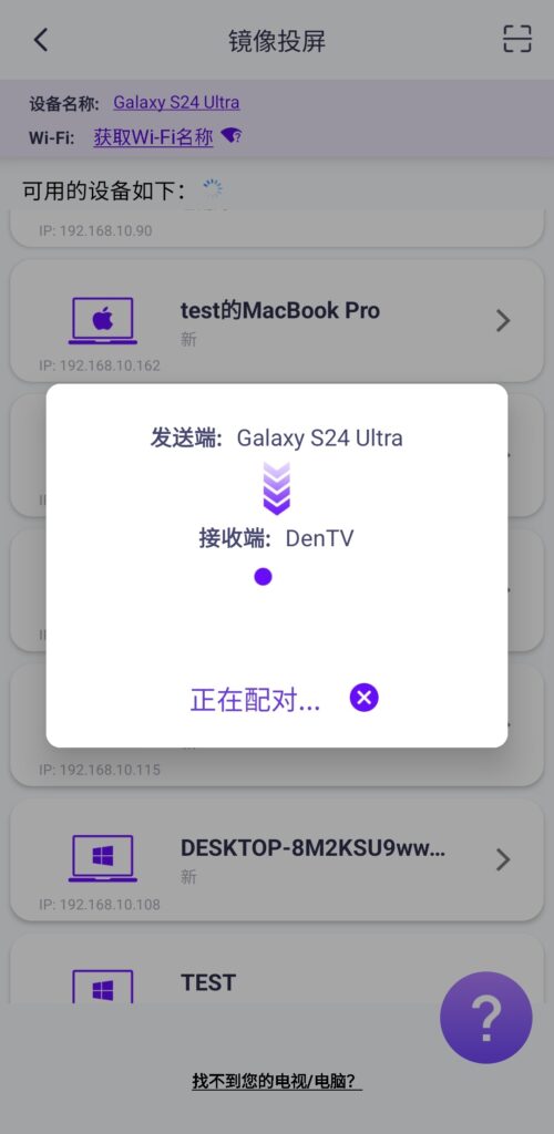 雨燕投屏会自动检测并显示同一局域网中所有支持投屏的设备(如智能电视、电视盒子或电脑)。
