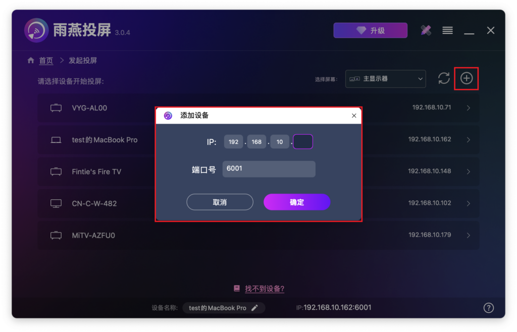 或可点击右上方加号按键,输入接收设备上显示的IP地址来连接。
