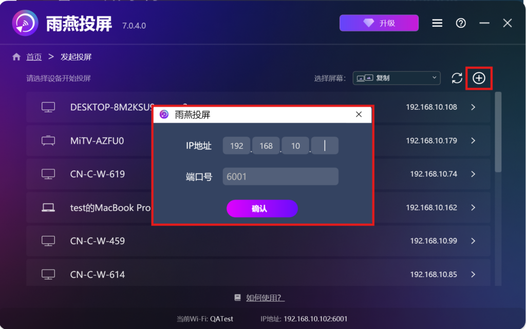 或可点击右上方加号按键,输入接收设备上显示的IP地址来连接。