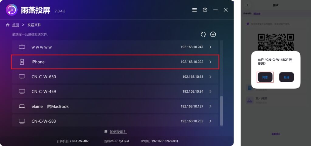 应用会自动搜索当前网络下可用的设备;从设备列表中选择你的手机,在手机上同意配对。