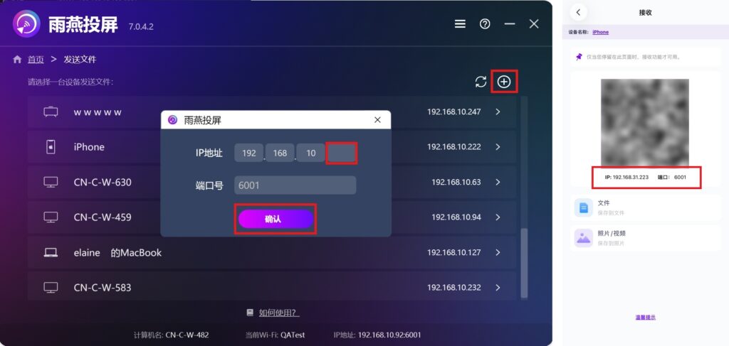 如果找不到你的手机,点击右上角+号,手动输入手机 IP 地址即可。