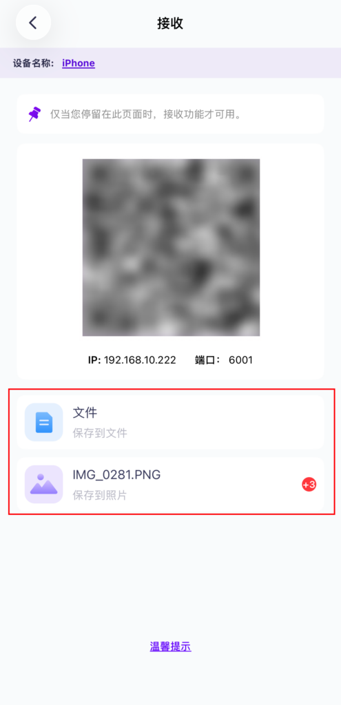 3. 在手机上点击“文件互传“>”接收“,并保持应用处于开启状态。