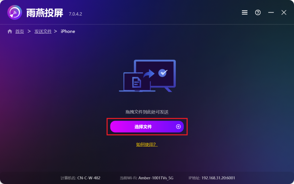 在电脑上选择要发送的文件,或直接拖拽文件到框内,文件会通过本地网络 直接传输给手机.