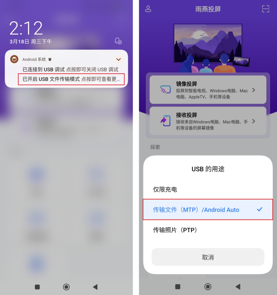 插上USB线之后,默认为充电模式,改为传输文件模式.