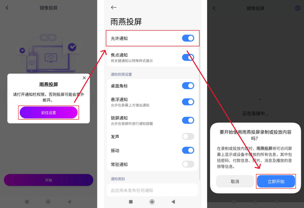 手机出现弹框,点击“前往设置”>“允许通知”,点击“立即开始”。