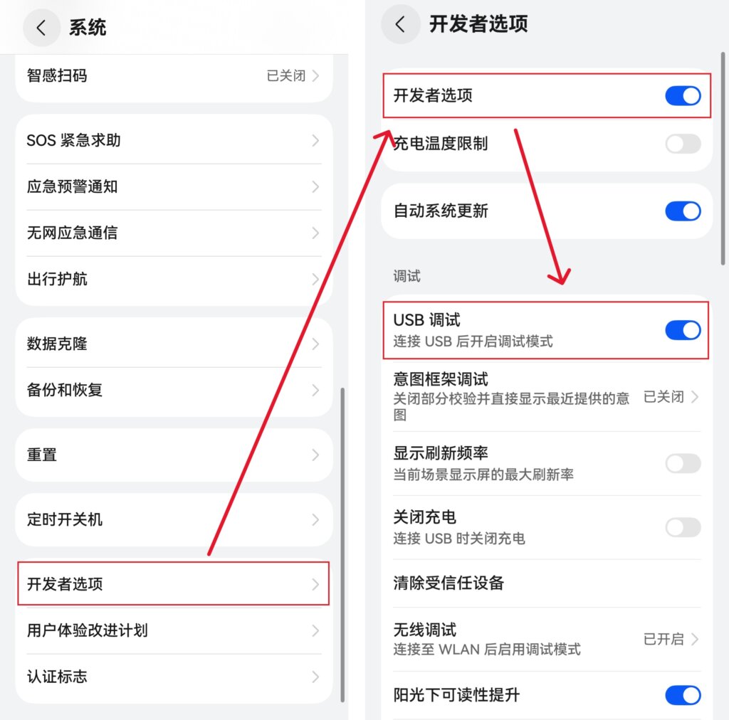 下滑,点击“开发者选项”,打开“开发者选项”及“USB调试”。