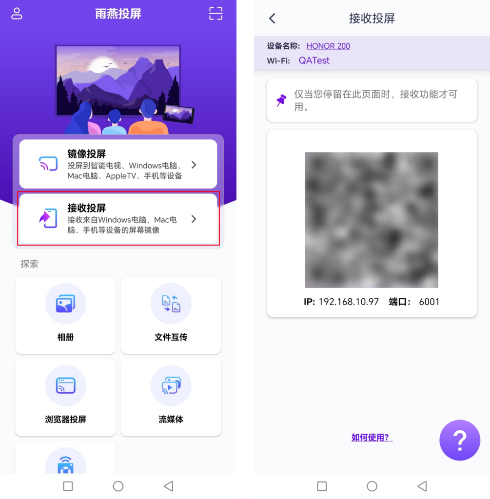1.在接收端安装并启动雨燕投屏,进入“接收投屏”界面