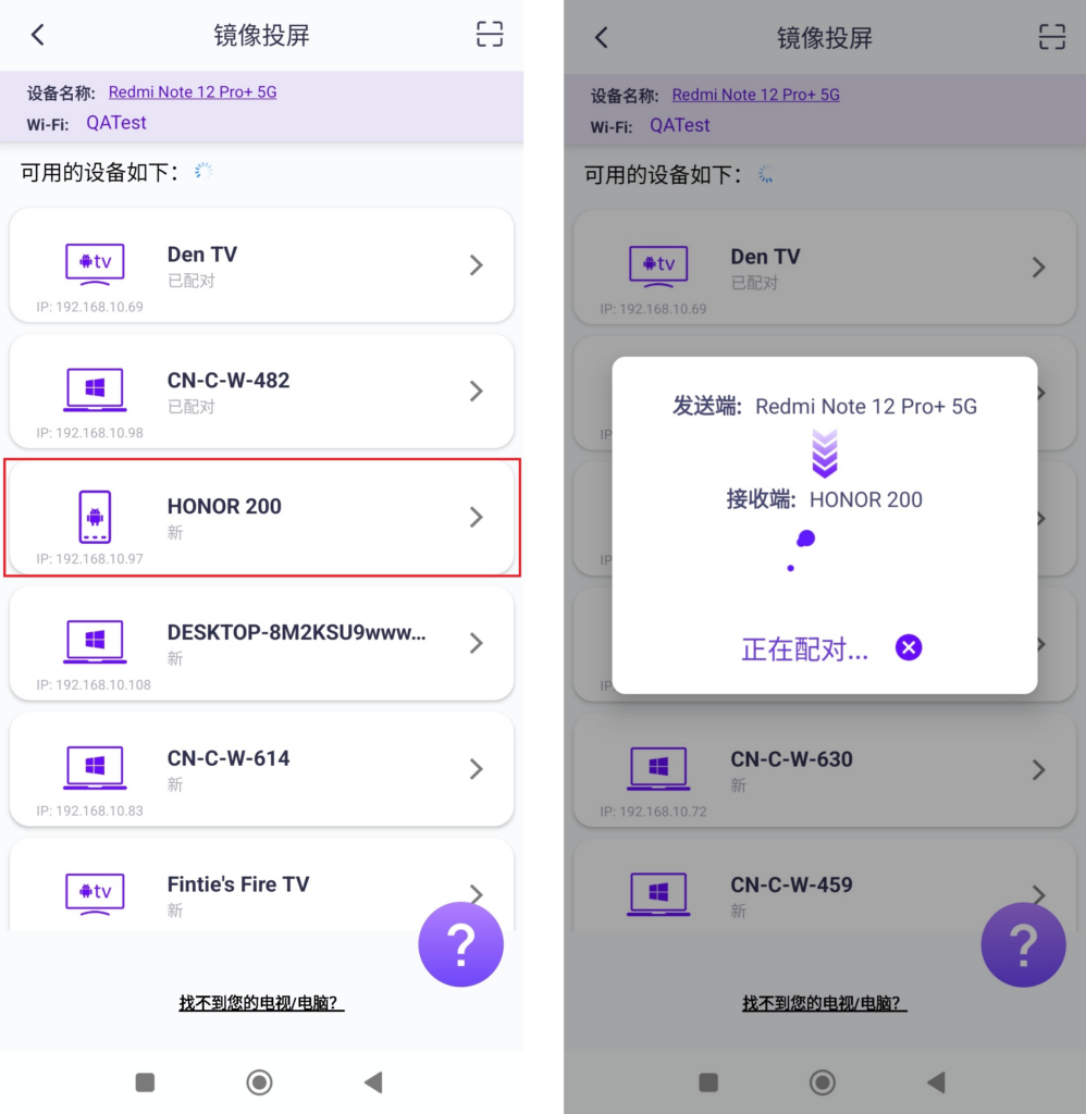 在发送端设备打开“Mirroring Screen Casting”功能,搜索到您的接收端设备并点击连接。