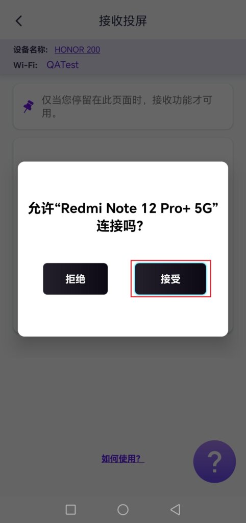 您的手机或平板上会弹出确认提示,点击“接受”即可完成连接,画面将流畅地投屏到您的设备上。