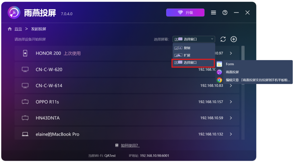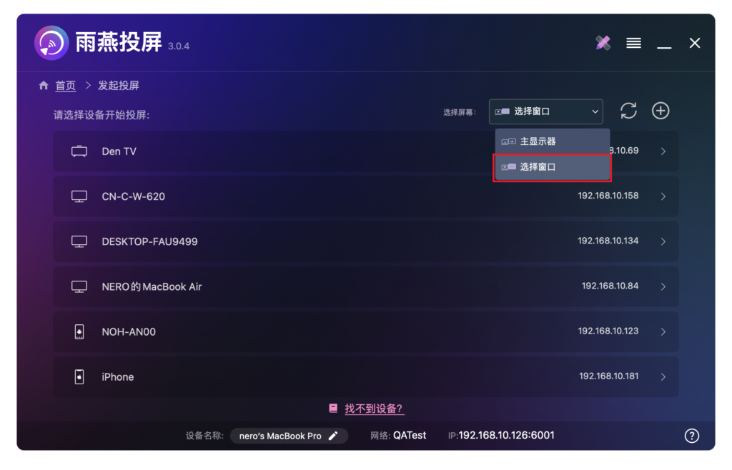 窗口投屏:选择特定窗口进行投屏。