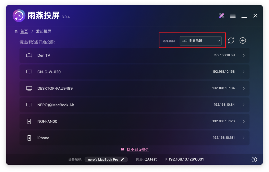 主显示器投屏:将 Mac 主屏幕内容投屏到 Android 设备。