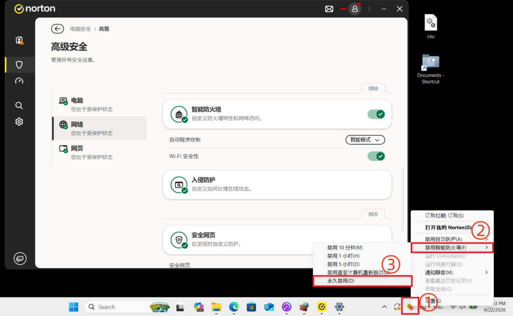- 选择 禁用智能防火墙,然后选择一个禁用时长(例如:10分钟、1小时,或直到电脑重启);或是直接在 Norton 360 的 高级安全>网络 中,关闭智能防火墙。
