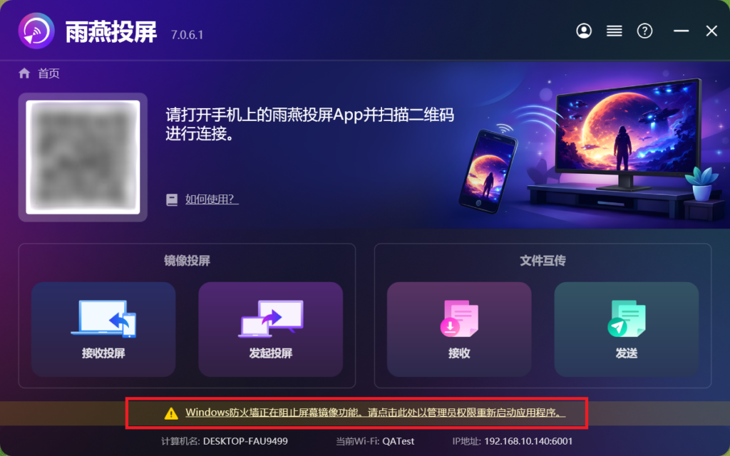 注意:禁用防火墙后,请重新启动投屏软件,再尝试接收投屏。