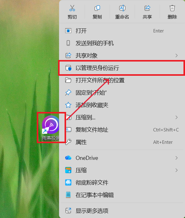 关闭雨燕投屏App,然后右键点击雨燕投屏的图标,选择“以管理员身份运行”。