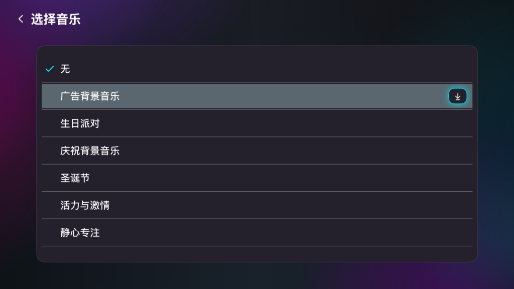 如果希望画面更有氛围,可以进入 音乐 页面,选择合适的背景音乐。