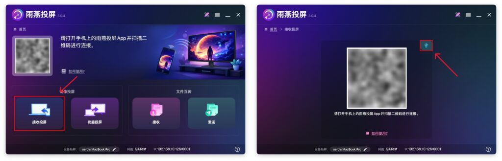 安装完成后,在Mac上打开应用,点击“接收投屏”,再进入有线投屏模式。