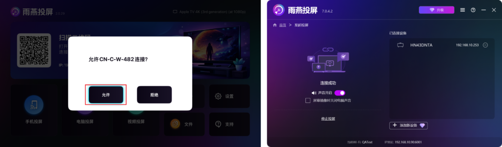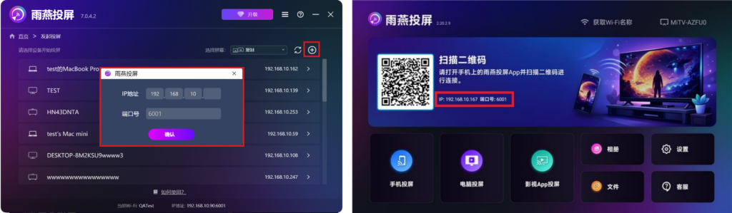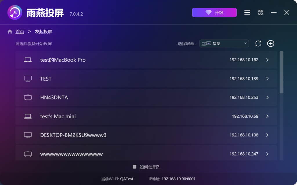 雨燕投屏会自动检测并显示同一局域网中所有支持投屏的设备(如智能电视、电视盒子或电脑)。选择目标设备即可启动镜像投屏。
