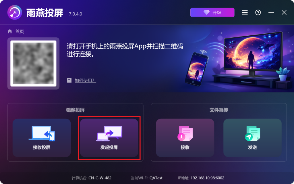 1)在Windows PC上点击【发起投屏】,搜索设备