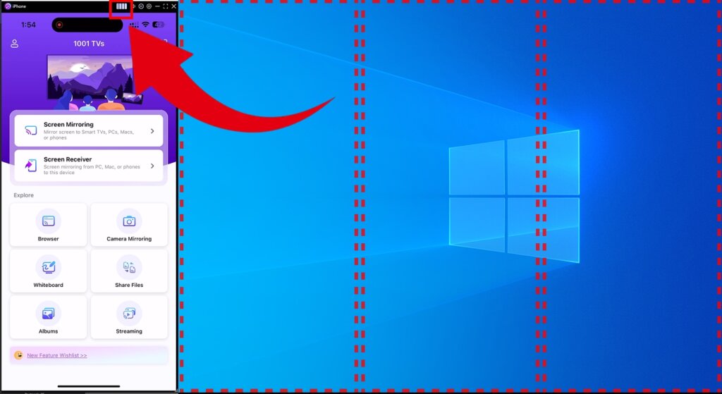 投屏连接成功后,点击标题栏中的「四格小方块」图标,窗口将自动四分屏。每台设备独立显示,适用于多人协作或对比展示场景,横竖屏均可。