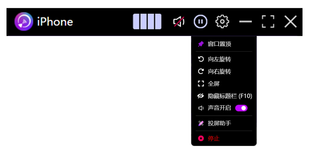 电脑端投屏窗口核心功能(分屏/全屏/暂停/隐藏标题栏)说明