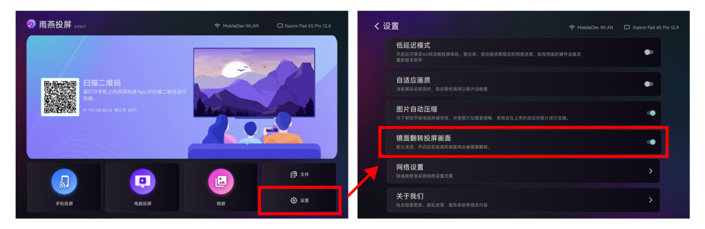 2. 关闭镜像翻转功能只需再次点击【设置】-【镜面翻转投屏画面】开关即可;