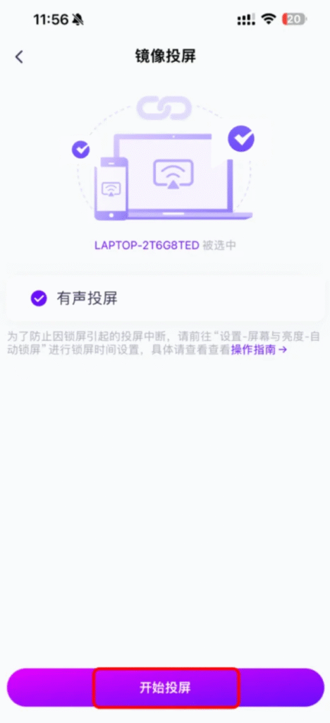 在电视上接受连接后,返回手机端,点击紫色的【开始投屏】按钮。