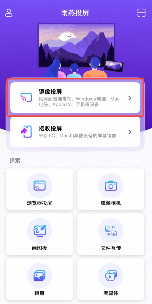 打开手机上的“雨燕投屏”App,选择“镜像投屏”。