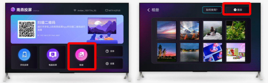 传输后即可在电视端全屏展示,支持单张查看、连播幻灯片、视频播放等模式。