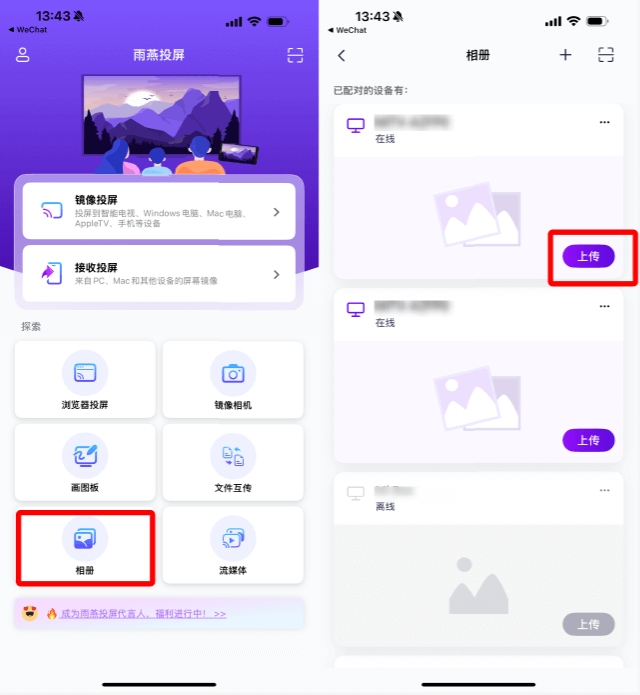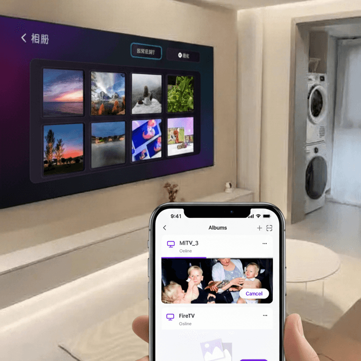 打开手机端 App,点击「相册」,系统会自动识别可连接的电视。